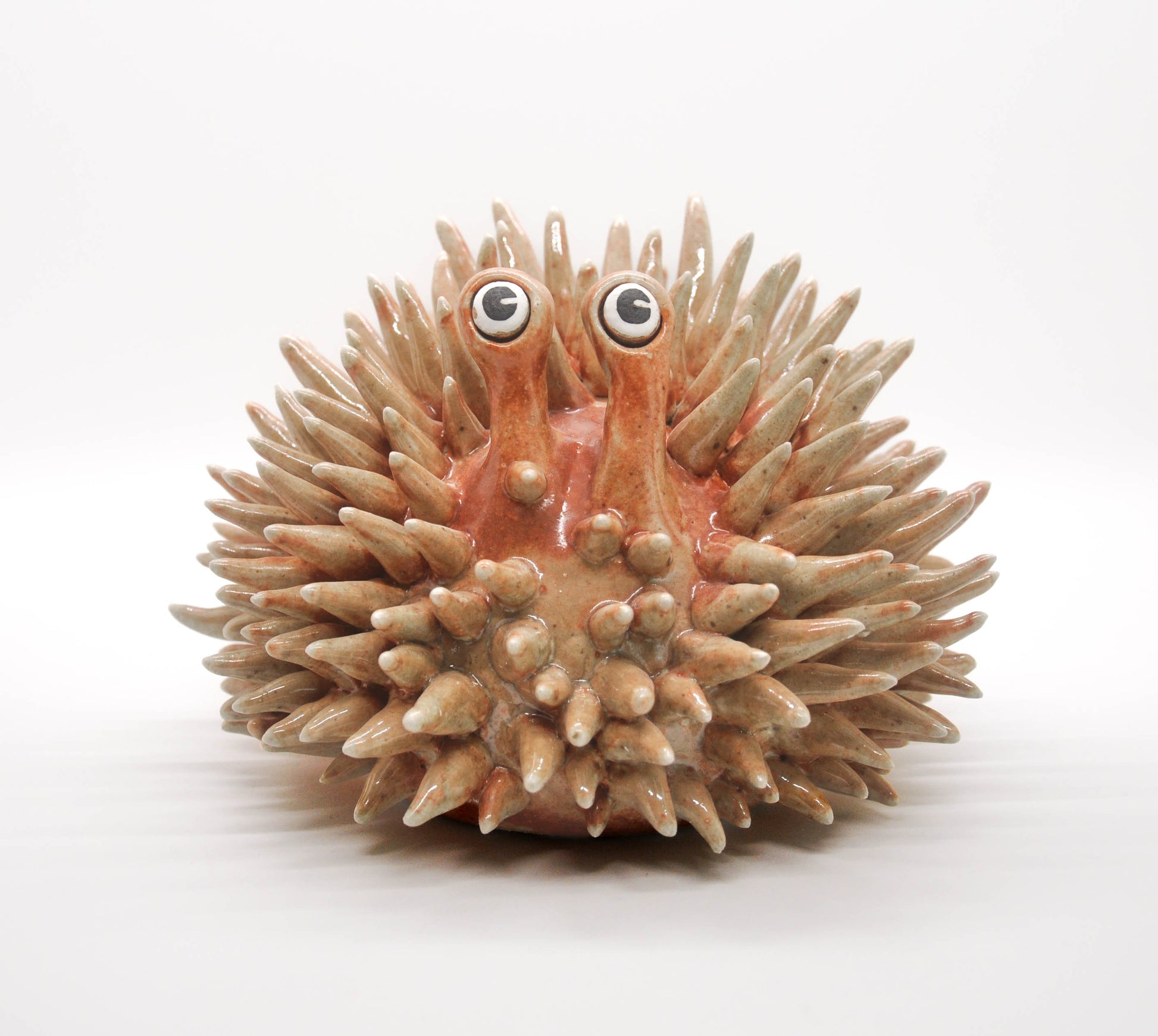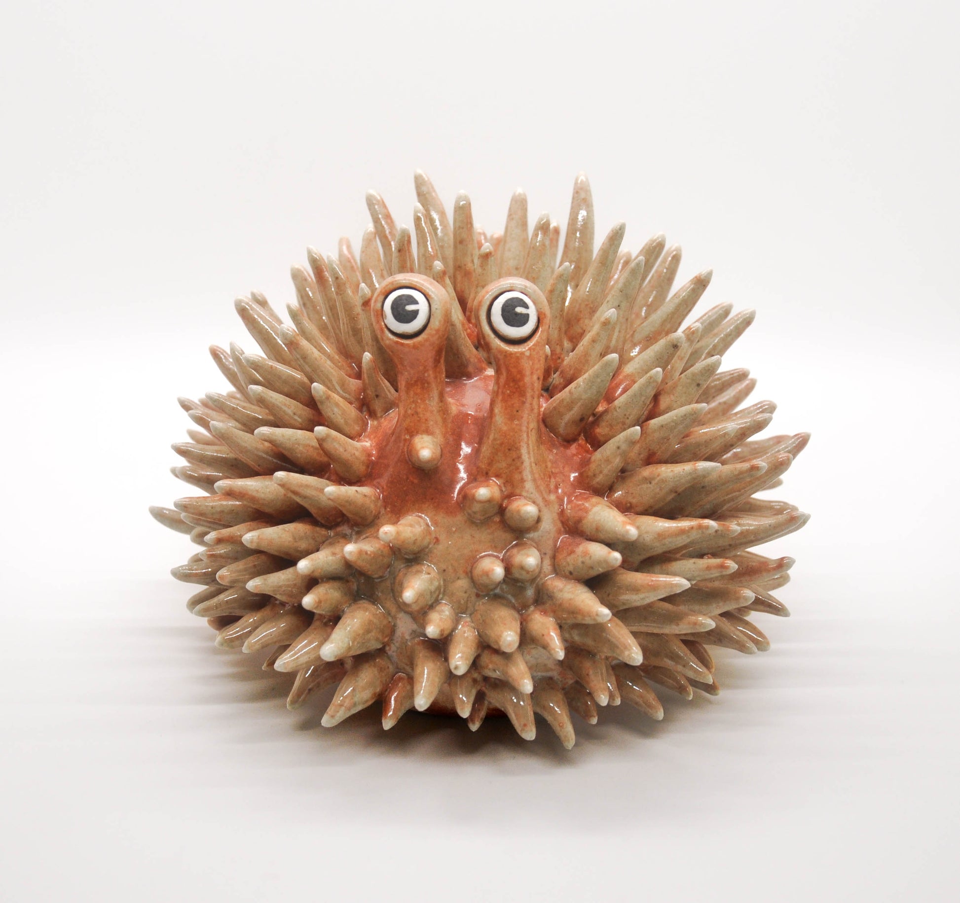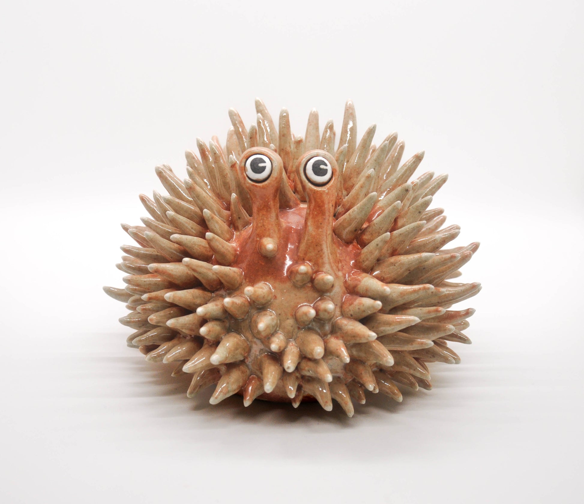 This stoneware ceramic urchin sculpture is hand-sculpted and glazed in a glossy shino glaze with subtle shades of earthly oranges. Each piece is unique, and designed with care. Handle gently with soft palms. Adopt today :)