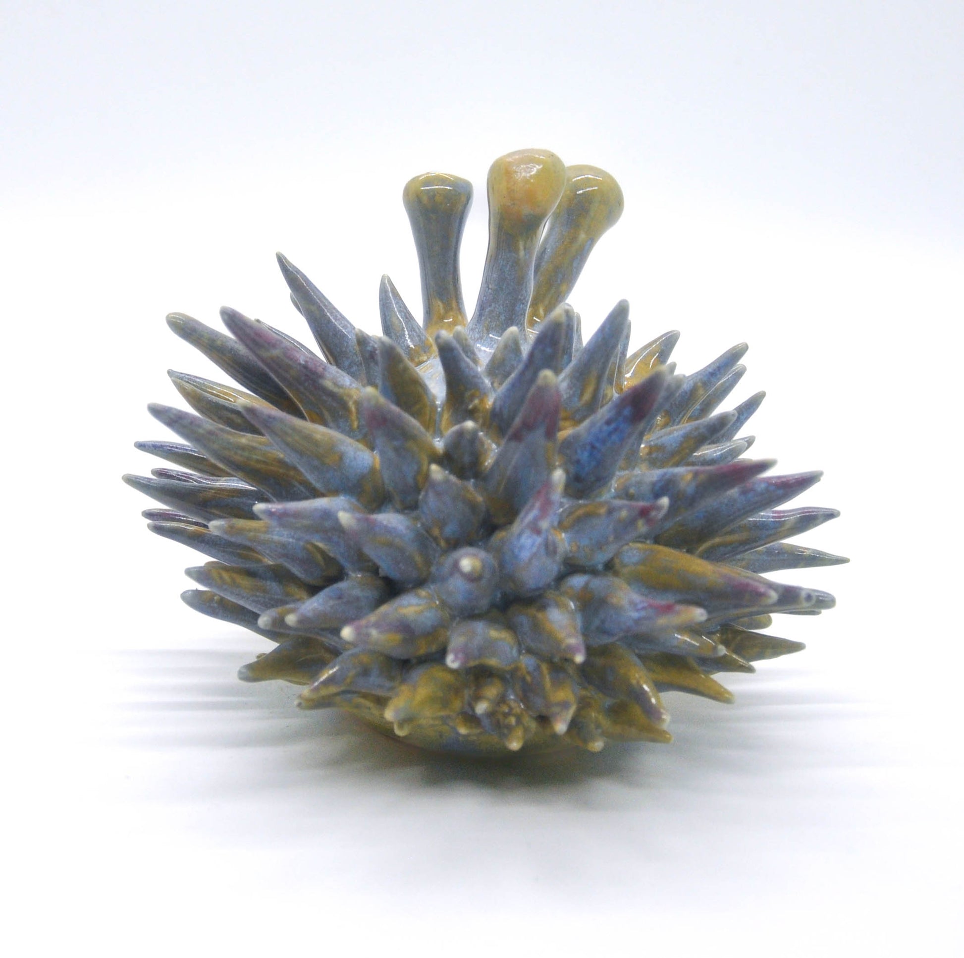 This white stoneware ceramic urchin sculpture is hand-sculpted and glazed with a glossy blue and green glaze. Limited edition design. Handle gently with soft palms. Adopt today :)